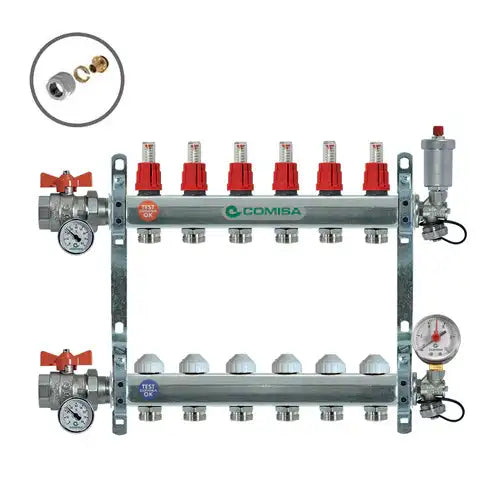 Stainless steel underfloor heating manifold pre-mounted on brackets. The manifold is supplied with flowmeters, fill and drain points, pressure gauge, auto air vent, isolation valves with temperature gauges, and pipe connectors. The manifold is supplied with an ESBE mixer and a Grundfos pump.